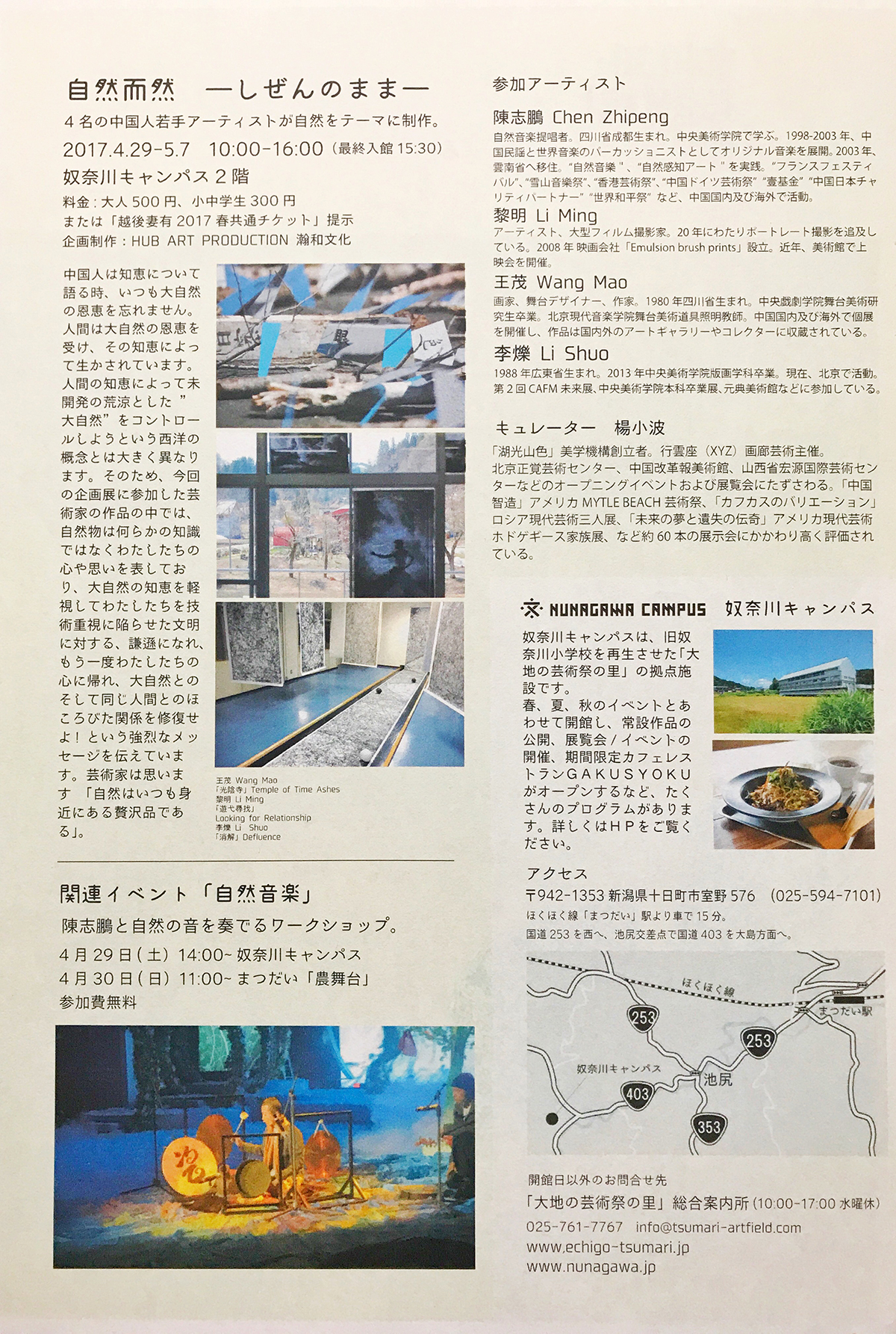 自然而然 时间:2017.4.29-5.7 地点:奴奈川小学 主办:HUBART瀚和文化 参展艺术家及作品:陈志鹏《自然音乐》 / 黎明《游弋寻找》 / 王茂《时间愉快的过去了》 / 李烁《消解》
