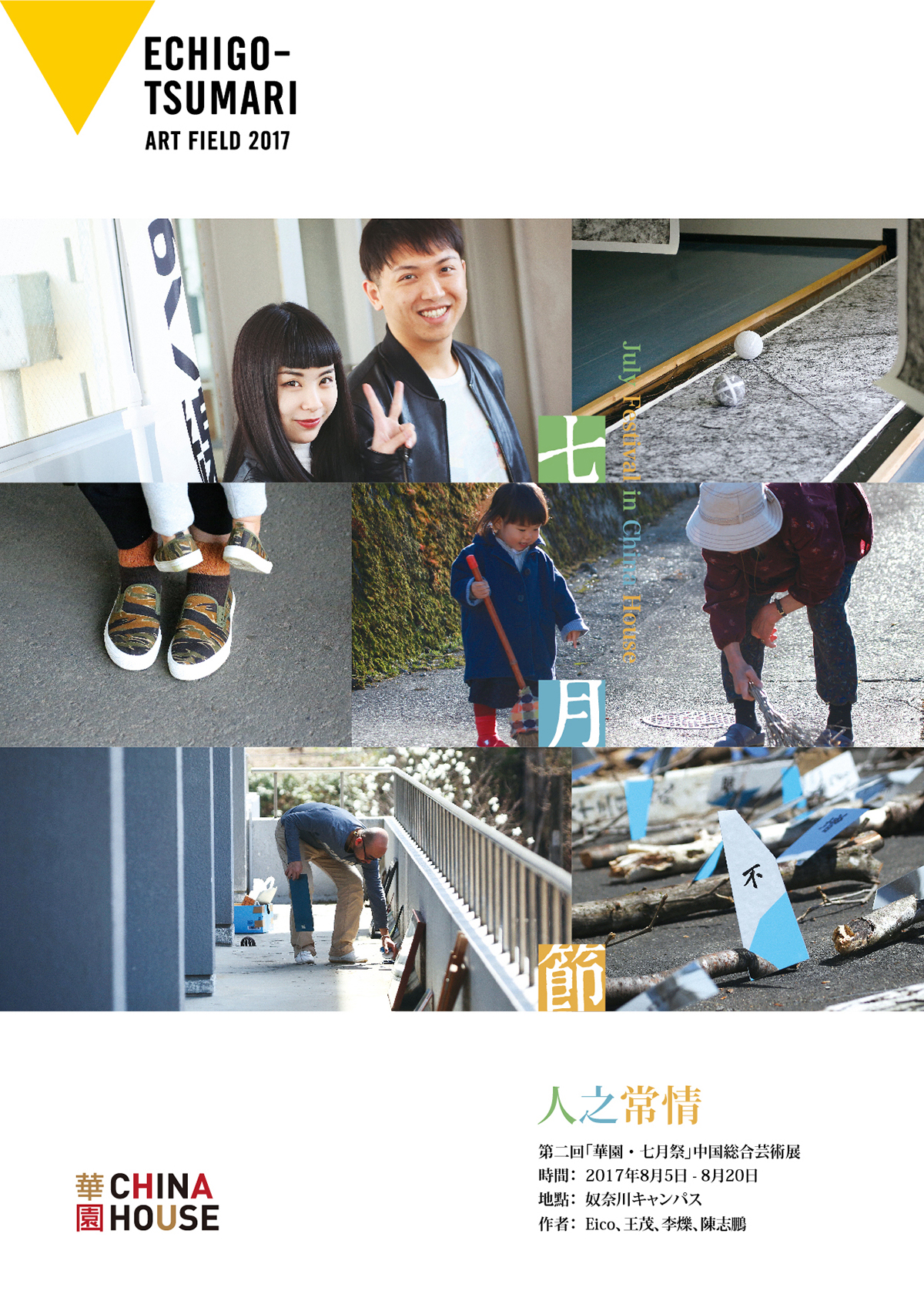 人之常情 时间:2017.8.5-8.20 地点:奴奈川小学 主办:HUBART瀚和文化 参展艺术家及作品:eico《福气在室野》 / 王茂《时间愉快的过去了》 / 李烁《消解》 / 陈志鹏《自然音乐》 / 24书屋