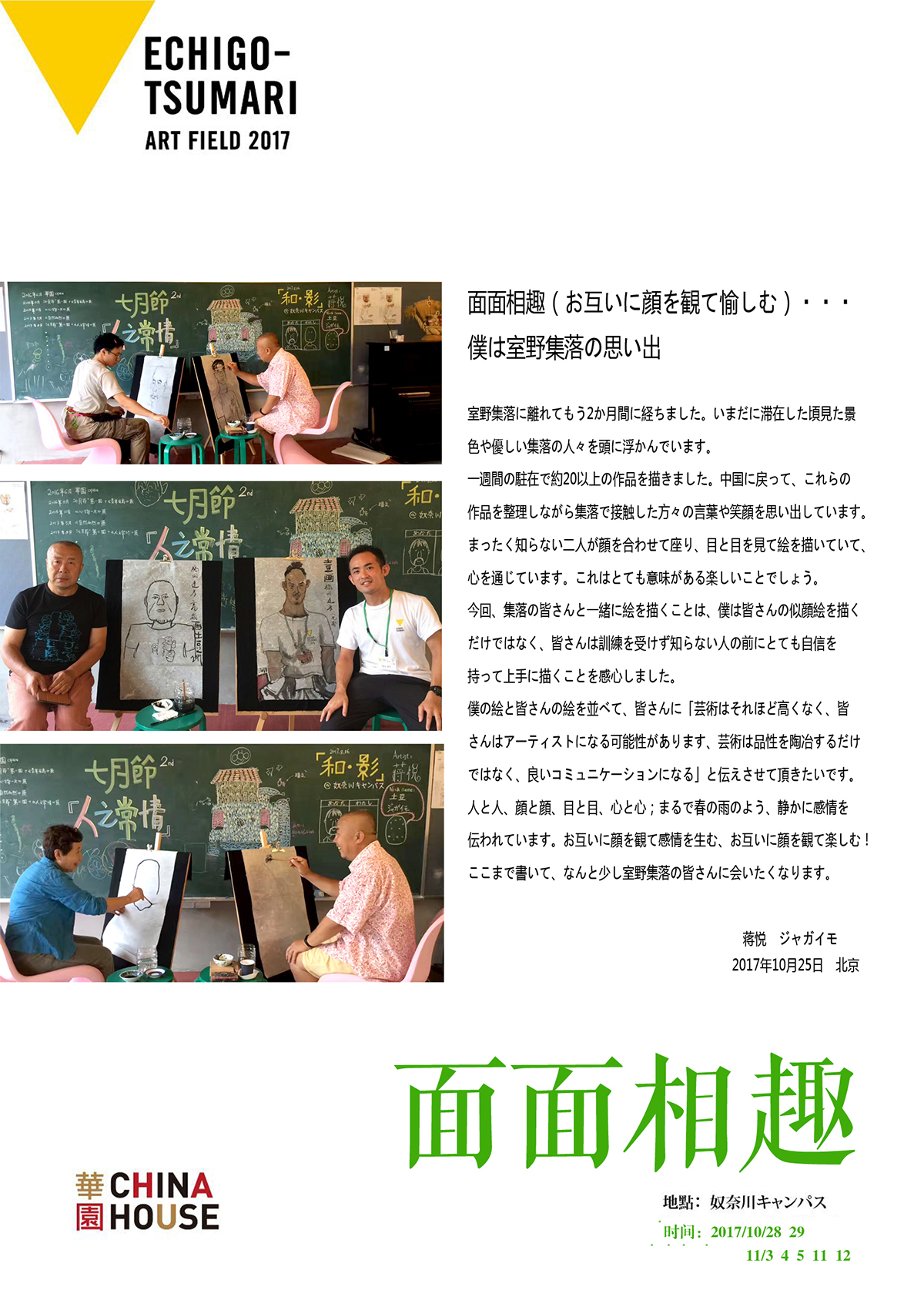 面面相趣 时间:2017/10/28,29-11/3,4,5,11,12 地点:奴奈川小学 主办:HUBART瀚和文化 参展艺术家:蒋悦