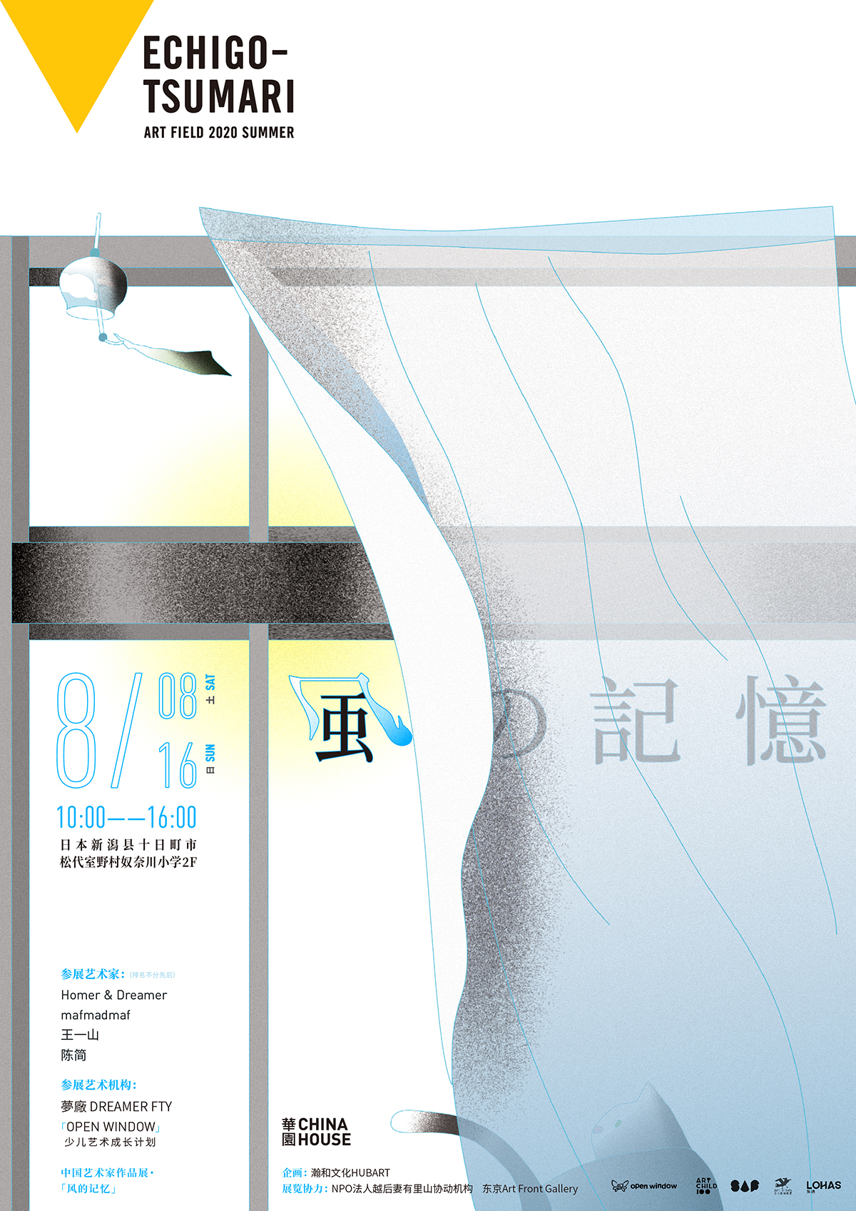 风的记忆 时间:2020年8月8日-16日 地点:奴奈川小学 策展:HUBART瀚和文化 参展艺术家及作品:Homer & Dreamer《看见了它》 / mafmadmaf《余下旅程的第一天》 / 王一山《冷记忆》 / 陈简《三喜的夏天》 参展艺术机构:梦厂Dreamer Fly / 「OPEN WINDOW」少儿艺术成长计划