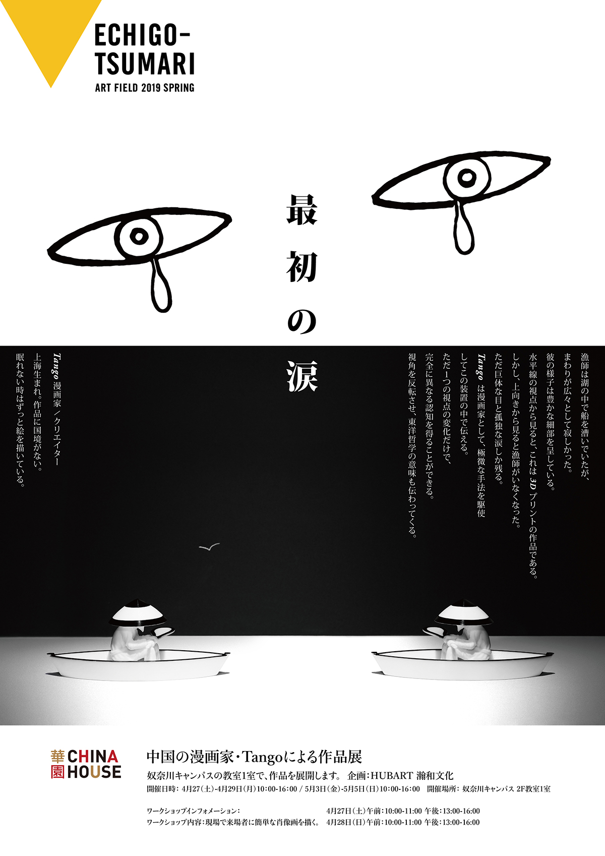 最初的眼泪 时间:2019年4月27日 - 4月29日,5月3日 - 5月5日 地点:奴奈川小学 策展:HUBART瀚和文化 参展艺术家:TANGO