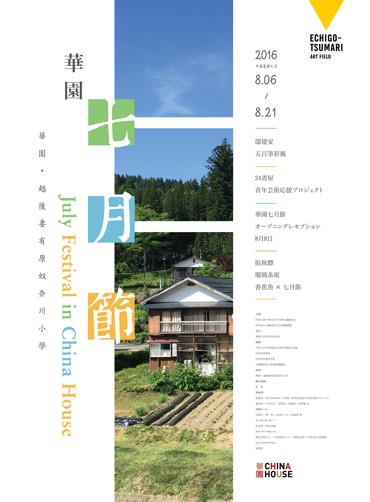 華园七月节 时间:2016.8.6-8.21 地点:奴奈川小学 主办:HUBART瀚和文化 NPO法人 越后妻有里山协动机构 执行:華园七月节实行委员会 后援:中华人民共和国驻日本国大使馆文化处 中华人民共和国驻新泻总领事馆 日本国外务省 日本国文部科学省 中国艺术品行业协会筹备组 总 策 划:孙倩 参展艺术家(机构):邬建安 / 青年艺术100 / E京华 / 德美艺嘉青年艺术扶持计划曹涤非 / 千里之行 / 找朋友 / 香蕉鱼 / 梁明毓 等 策划团队:何海洋 / 冯雪 / 1518组合 / 刘凌波 等 协 调:西美夏 / 新井沙织 媒体支持:雅昌艺术网 / 中国艺术网 / 中国文化网 / 中外文化交流杂志 形象设计:意鸣堂 |