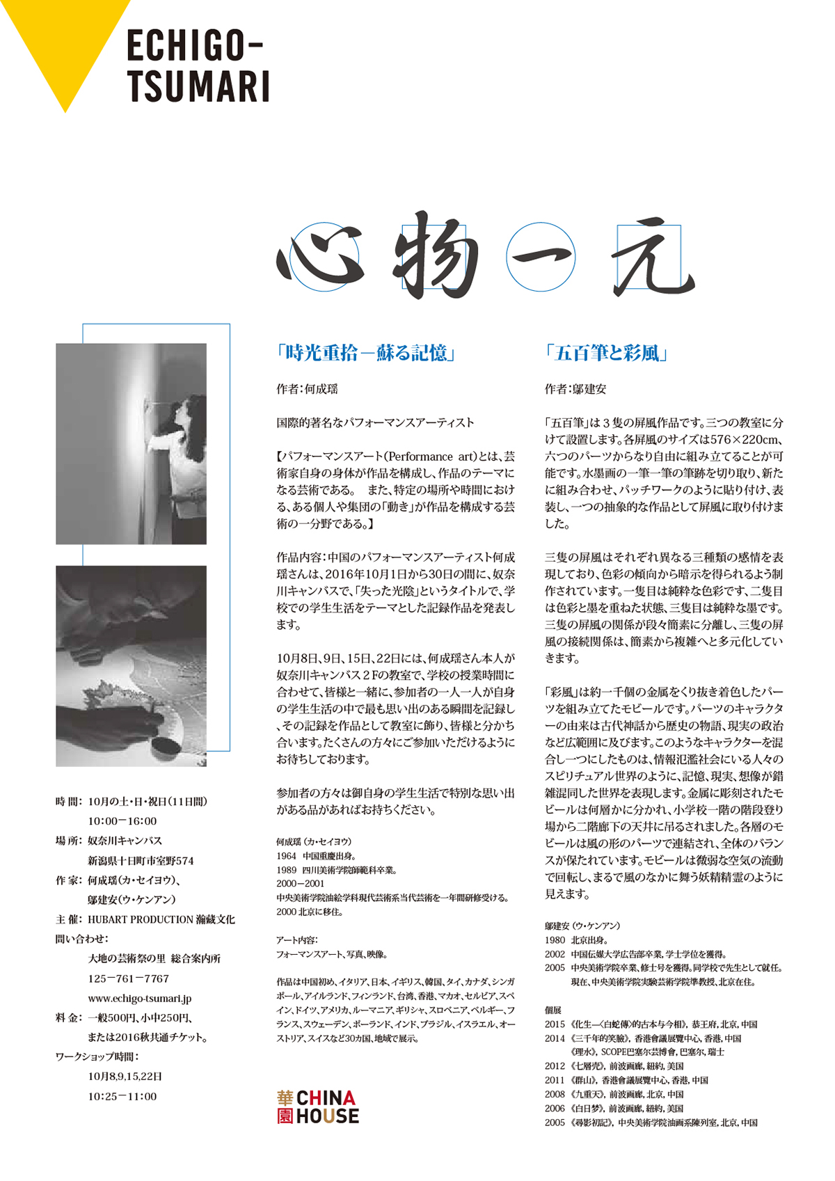 由瀚和文化孙倩于2016年创办的CHINAHOUSE華园,作为首个在越后妻有大地艺术节正式落地的中国艺术机构,一直以向日本以及全世界推介中国优秀的艺术家和中国当代艺术为宗旨,将中国艺术家带到越后妻有进行交流和创作,得到了中国驻日使馆、领馆的大力支持。自成立以来, CHINAHOUSE華园持续策划并举办各类艺术展览、驻留计划、交流活动和研发体验,达几十余场,是越后妻有大地艺术节、NPO越后妻有里山协动机构的重要合作伙伴。